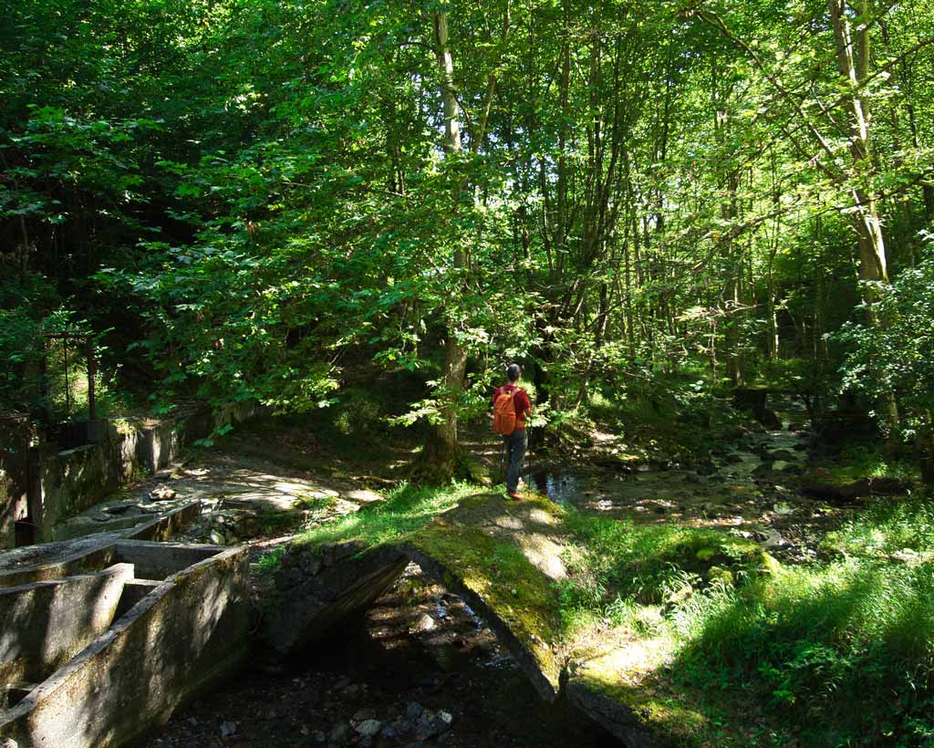 A medida que avanzamos, el sonido del agua nos acompa creando una sinfonía natural que invita a la relajación. El camino está bien señalizado con marcas azules y blancas lo que facilita la orientación. Tras unos minutos de caminata, llegamos a un antiguo puente junto a una pequeña presa, un lugar perfecto para una breve pausa y algunas fotos.